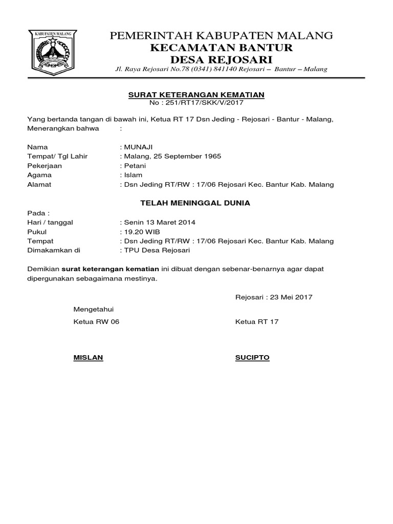Contoh Surat Kematian Surat Keterangan Kematian Desa Rt from suratku.id Home » contoh surat » contoh surat keterangan kematian dari rt. Contoh surat keterangan kematian rating: Contoh surat keterangan kerja (untuk paspor). Contoh surat kematian dari rt. 100% based on 99998 ratings. Demikian surat keterangan kematian ini kami buat dengan sebenarnya agar dapat digunakan sebagaimana mestinya. Untuk membuat rekening bank dibutuhkan data informasi pribadi yang dibuktikan dengan identitas. Contoh surat keterangan penelitian di atas harus menggunakan kop perusahaan atau lembaga dan dibubuhi stempel sebagai penanda bahwa surat tersebut resmi dan asli.
